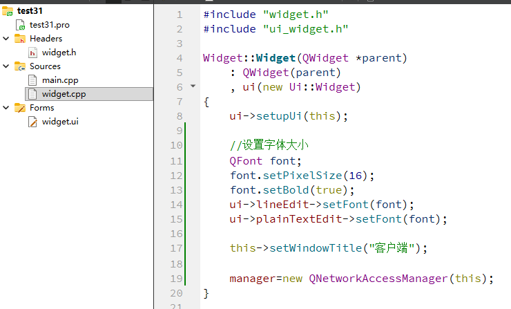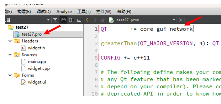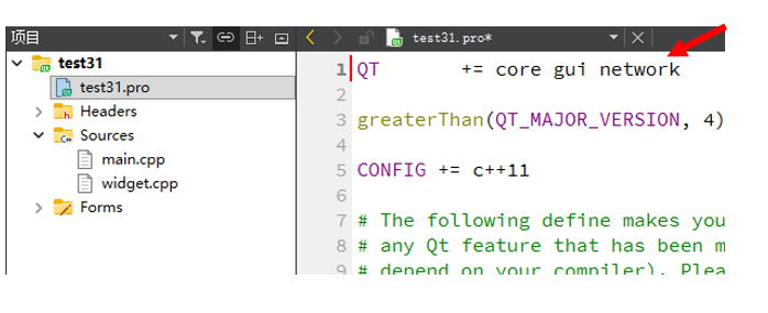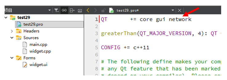 在进⾏⽹络编程之前,需要在项⽬中的.pro ⽂件中添加 network 模块.
