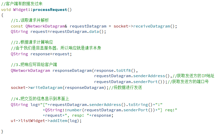 的“邮箱”(socket缓冲区)中读取一个等待处理的UDP数据报。它不接收任何参数,并返回一个 QNetworkDatagram