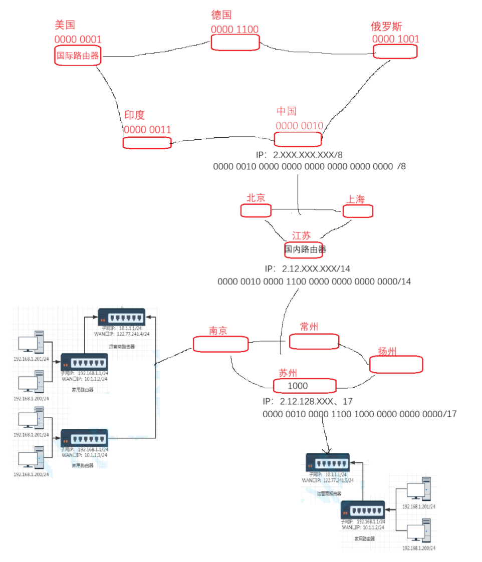 - 省级路由器用/14掩码定位江苏省,转发至市级路由器。
