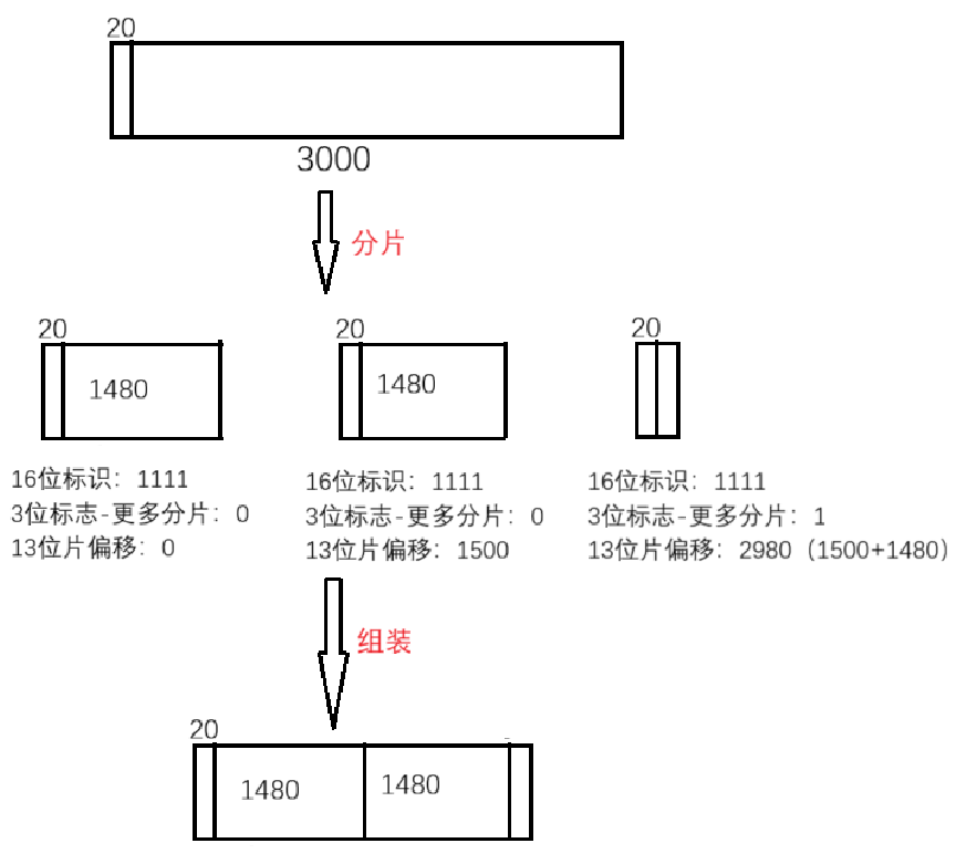第 1 片 | 1234 | 001 | 0 | 20 字节报头 + 1480 字节数据 | 占原始数据 1-1480 字节 |