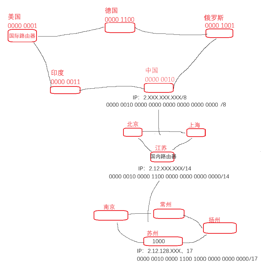 - 中国国际路由器接收后,用/8掩码匹配中国地址段,转发至国内省级路由器。