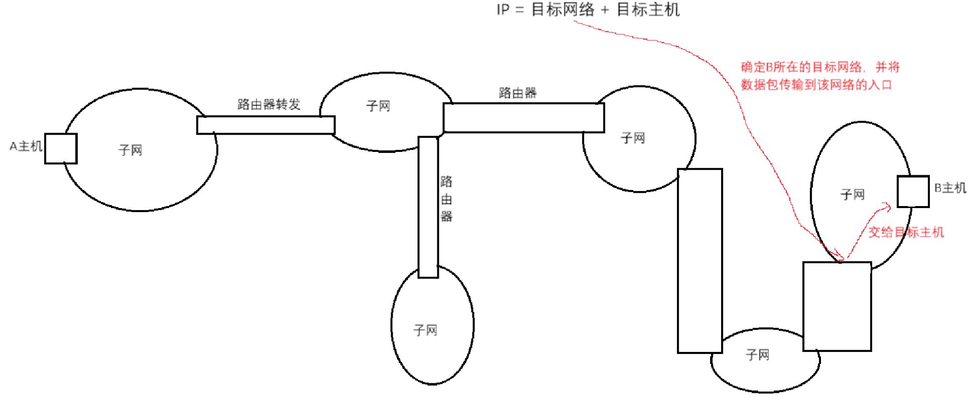 - 示例:当主机A要向主机B发送数据时,首先需要确定B所在的目标网络,并将数据包传输到该网络的入口;到达目标网络后,再通过主机标识找到并交付给具体的目标主机B。(凭借路由器转发完成)