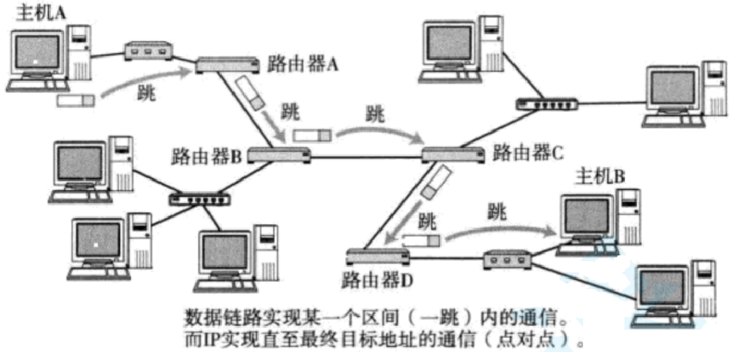 通过 “一跳一跳(Hop by Hop)” 的 “问路” 过程转发数据包,“一跳” 指数据链路层中从源 MAC 到目的 MAC 的帧传输区间。