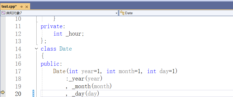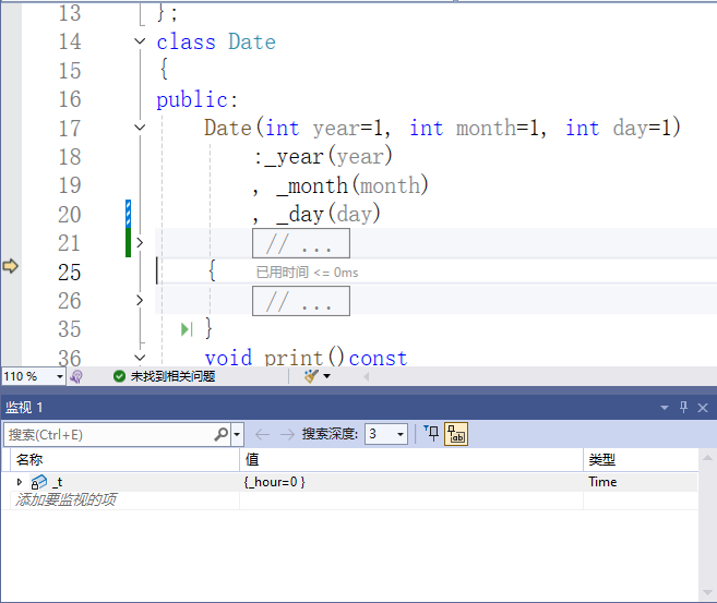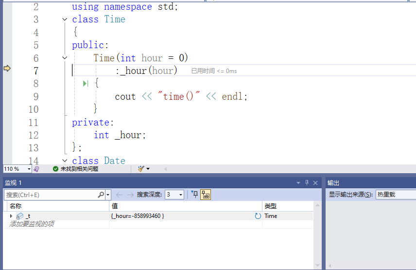 Date类中有一个自定义类型的类成员变量_t,_t并没有在初始化列表里初始化,那么编译器会调用_t的默认构造函数Time(int hour=0)进行初始化,可以F11逐语句调试并监视成员变量_t的变化情况。