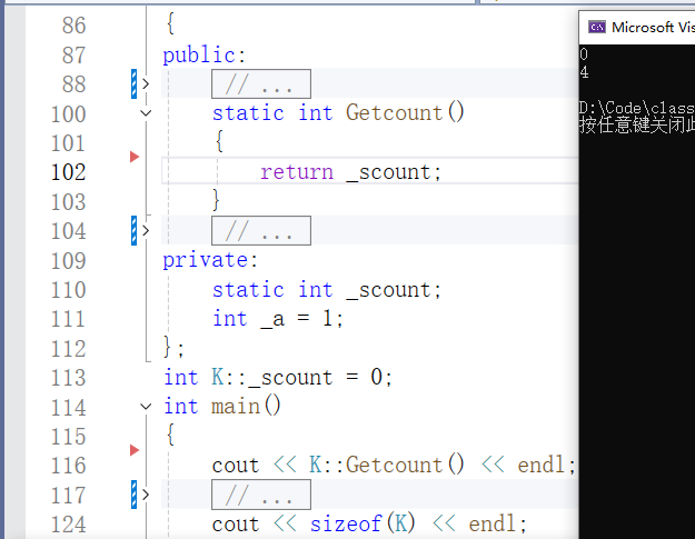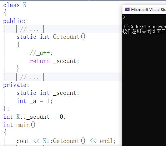 {cout << K::Getcount() << endl;cout << sizeof(K) << endl;