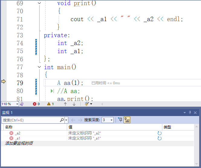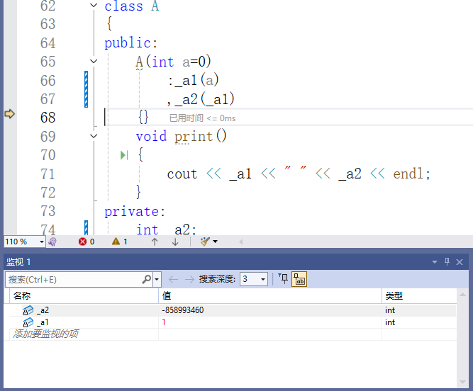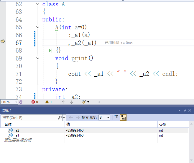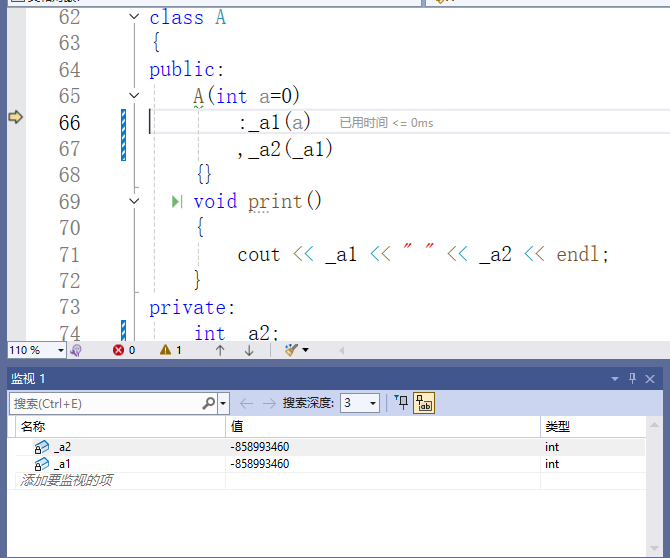 如上代码所示,成员变量的声明顺序为_a2、_a1,故初始化列表的初始化顺序也为_a2、_a1,具体过程可见下图调试过程,通过监视观察_a2、_a1的变化。