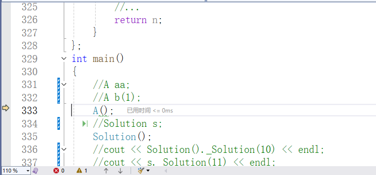 {A aa;A b(1);A();//匿名对象Solution s;Solution();//匿名对象cout << Solution()._Solution(10) << endl;cout << s._Solution(11) << endl;return 0;
