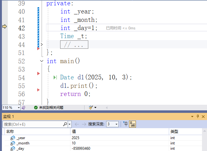 如(9)所示,构造并初始化对象d1,即Date d1(2025,10,3),则_year、_month初始化为2025、10,_day没有在初始化列表中初始化,故_day的值为_day声明位置的缺省值1,则d1的结果为2025/10/1,。