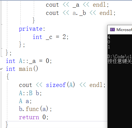 {cout << sizeof(A) << endl;A::B b;A a;b.func(a);return 0;