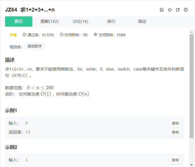 首先定义类Sum,静态成员变量_i、_ret用于实现求和,_i初始化为1,_ret初始化为0,在构造函数Sum函数体中,_ret+=_i,_i++,可以通过多次构造Sum即可实现累加求和,成员函数Getret用于返回_ret,_ret即为1+2+...+n的结果,类Solution的成员函数Sumsolution用于求和,函数参数为整形n,通过Sum的数组,构造n个Sum,就调用了n次构造函数,从而实现n次累加求和,最后通过Sum::Getret()函数返回_ret,即为所求的结果。
