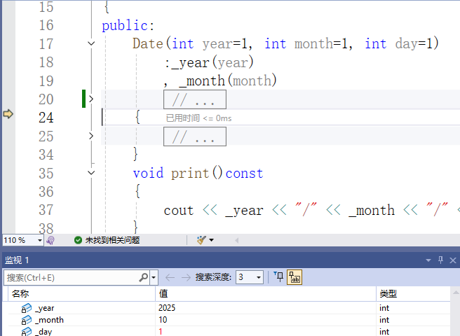 如(8)所示,通过监视1窗口可以看出_day的值为缺省值1,说明对于没有显示在初始化列表初始化的成员变量,该成员变量的值为声明处的缺省值。