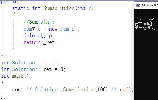 public:static int Sumsolution(int n){//Sum a[n];Sum* p = new Sum[n];delete[] p;return _ret;}