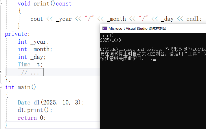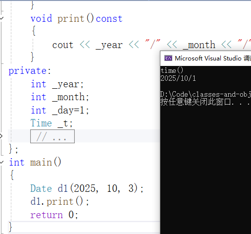 {Date d1(2025, 10, 3);d1.print();return 0;