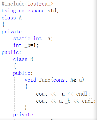public:class B{public:void func(const A& a){cout << _a << endl;cout << a._b << endl;}private:int _c = 2;};