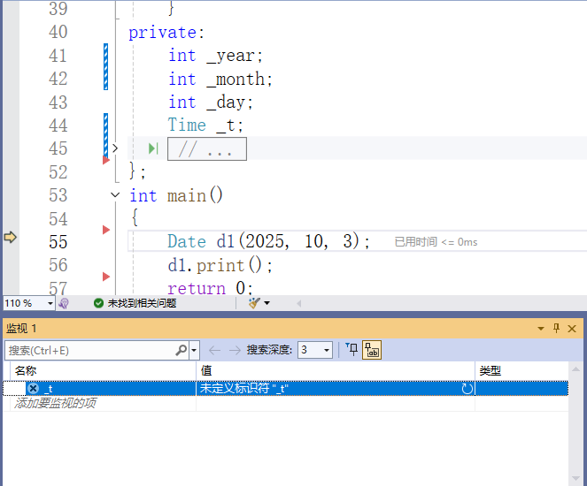 显示窗口上显示 time(),说明了初始化类成员_t时调用了_t的默认构造函数,来完成对_t的初始化,因此对于没有显示在初始化列表初始化的自定义类型成员,编译器会调用这个成员类型的默认构造函数,如果没有默认构造函数,那么就会编译报错,所以对于如果没有默认构造的类类型成员变量,也必须放在初始化列表位置进行初始化。