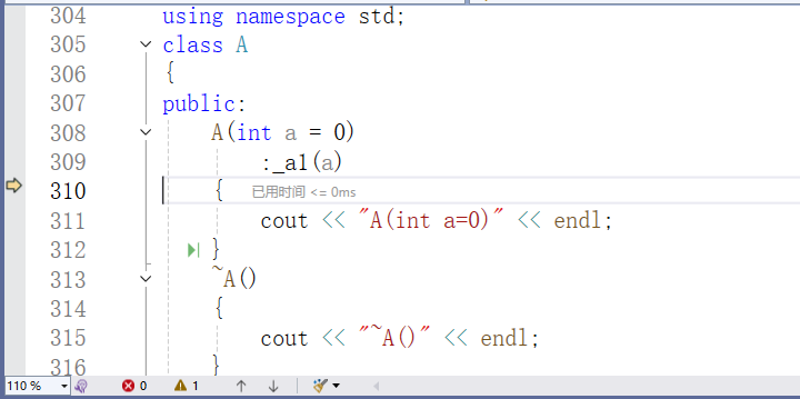 public:A(int a = 0):_a1(a){cout << "A(int a=0)" << endl;}~A(){cout << "~A()" << endl;}
