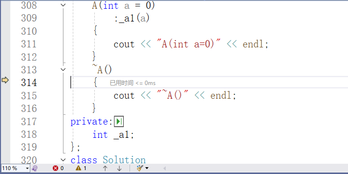 在定义对象时,我们可以定义匿名对象,匿名对象的特点是不用取名字,如上面的A(),Solution(),都是匿名对象,匿名对象的生命周期只有它定义的这一行。下面所示是F11调试观察匿名对象A()的变化情况。