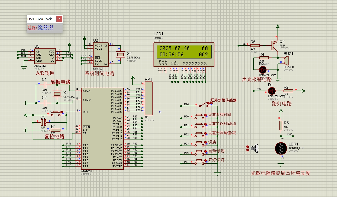 系统采用STC89C52作为主控芯片,通过光敏电阻与ADC0832芯片检测环境光照强度,配合DS1302时钟芯片实现时间控制。LCD1602液晶屏用于显示时间、光强及工作状态,红外传感器和噪声模块用于检测,蜂鸣器实现故障报警功能。