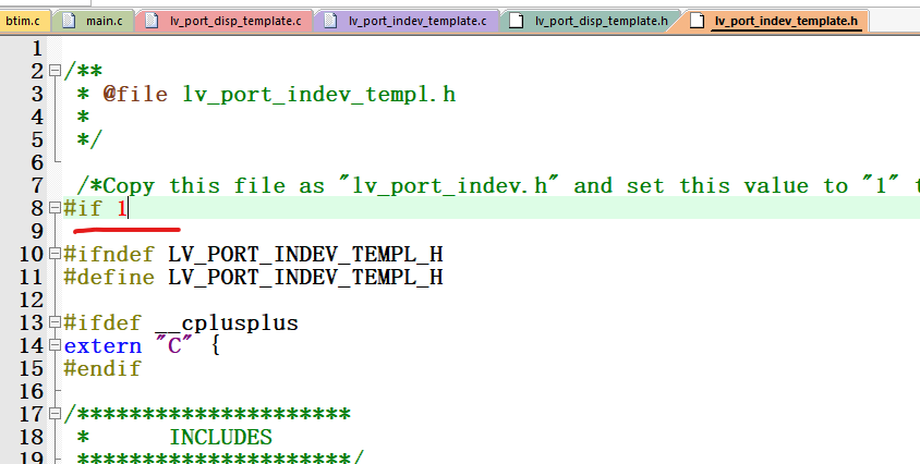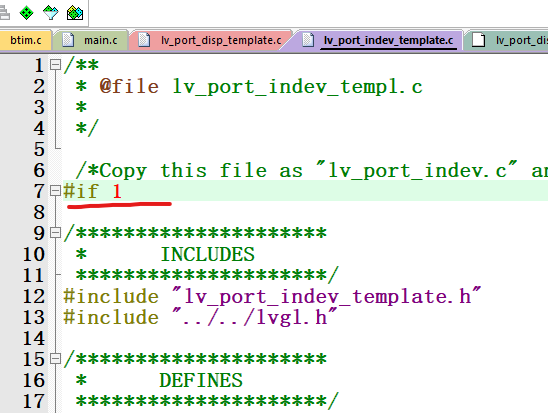 和 lv_port_indev_template.c/h(触摸输入相关)文件,将这 4 个文件中的条件编译指令#if 0 都
