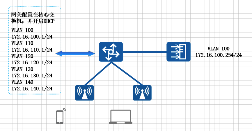 - 核心层:由网关设备(IP:172.16.100.1)承担路由转发,连接无线控制器与上层网络(如互联网、核心业务区);无线控制器(管理 IP:172.16.100.254)作为核心管控节点,通过 Trunk 接口(如 G0/2)连接 AP 设备,AP 负责无线信号覆盖;