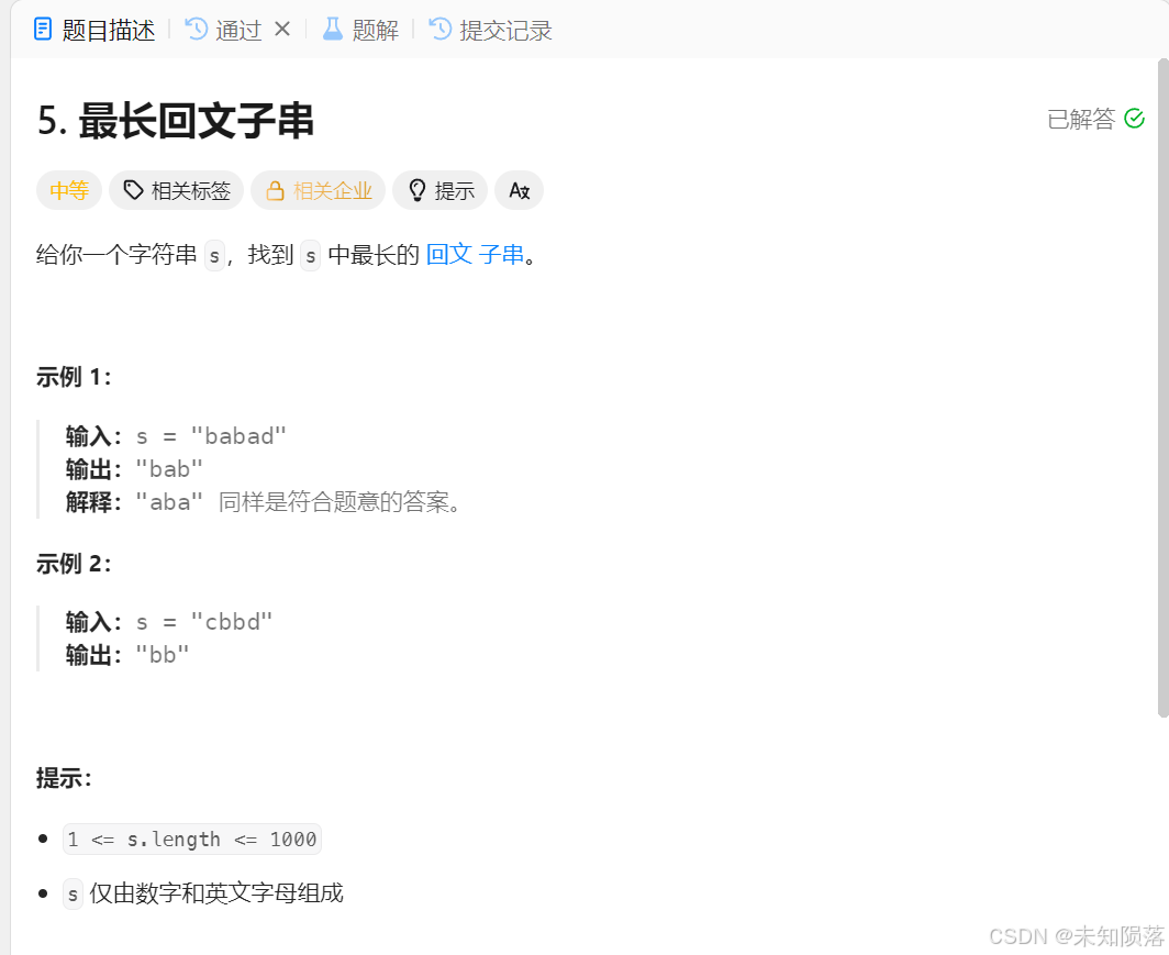public:string longestPalindrome(string s) {int n = s.size();vector<vector<bool>> dp(n, vector<bool>(n));int begin = 0, len = 0;for(int i = n - 1; i >= 0; i--)for(int j = i; j < n; j++){if(s[i] == s[j])dp[i][j] = i + 1 < j ? dp[i + 1][j - 1] : true;if(dp[i][j] && j - i + 1 > len){len = j - i + 1;begin = i;}}return s.substr(begin, len);}