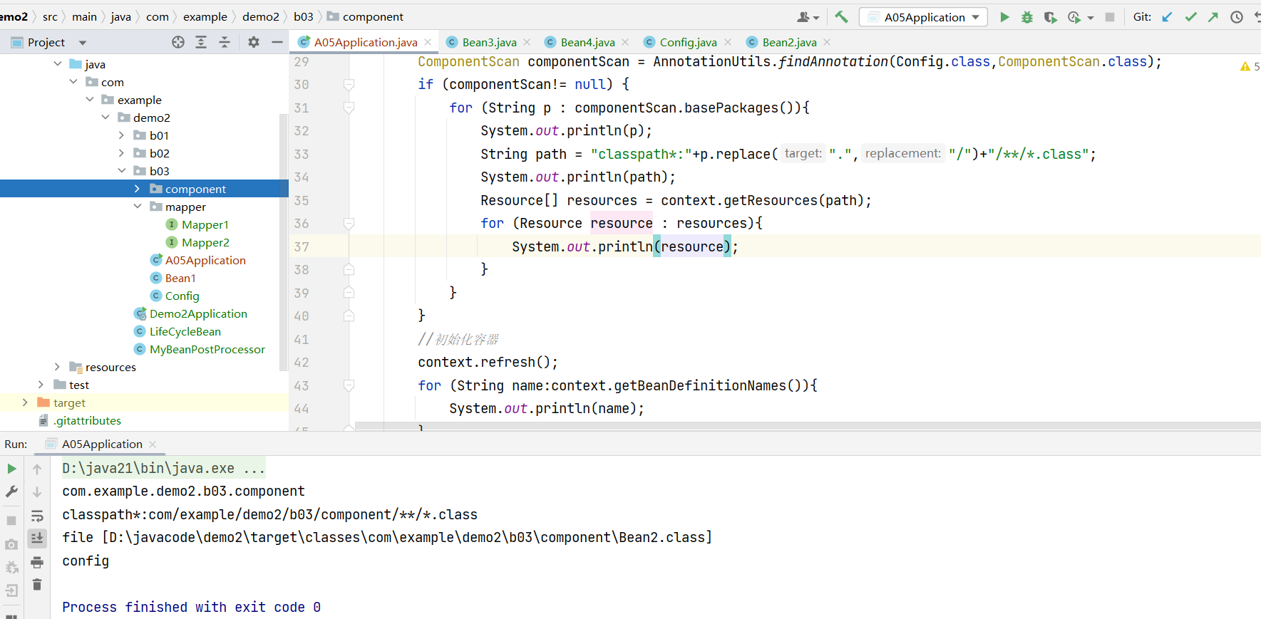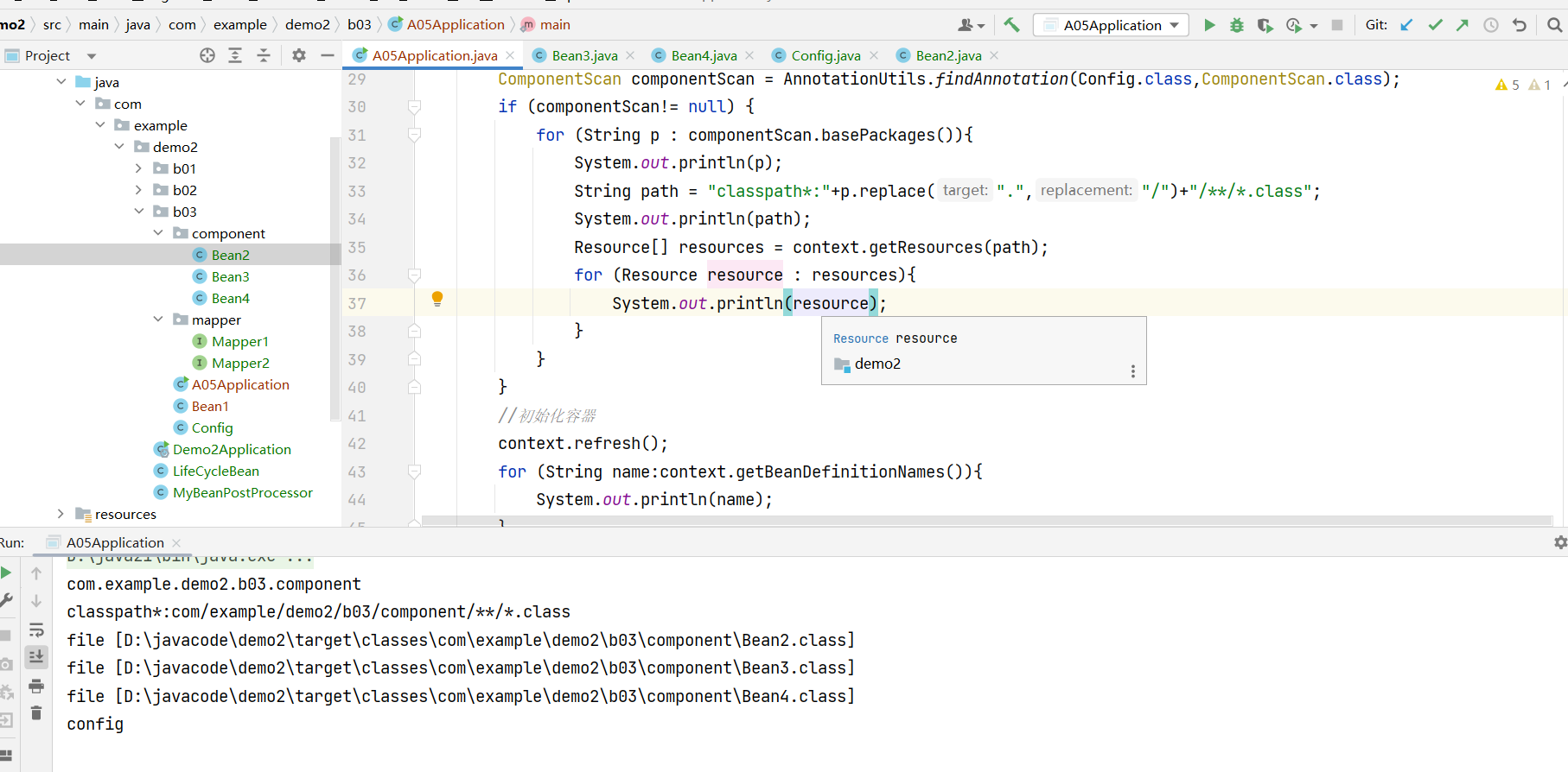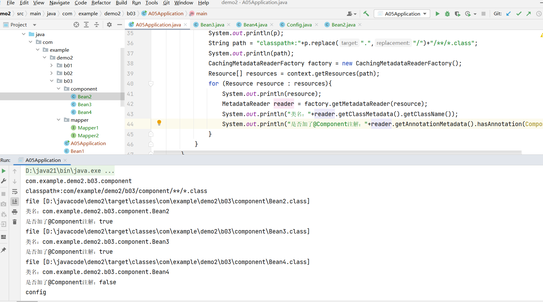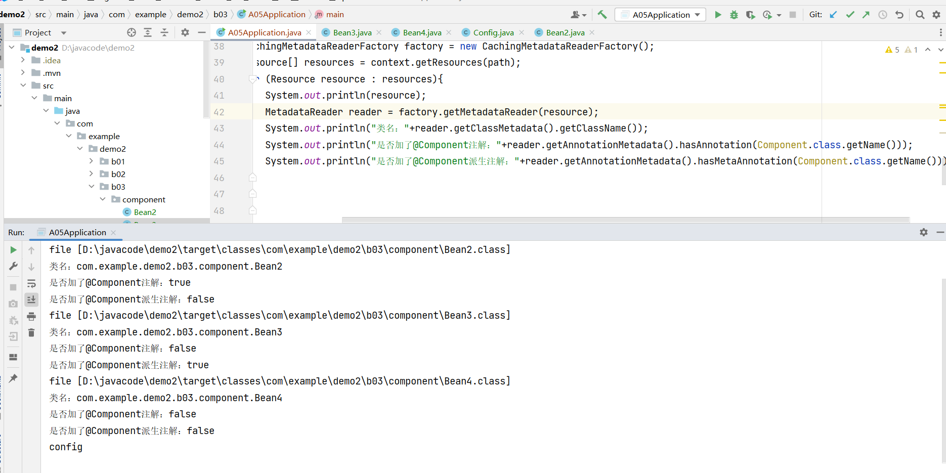 在com.example.demo2.b03.component中添加Bean,其中Bean4不加@Component注解。