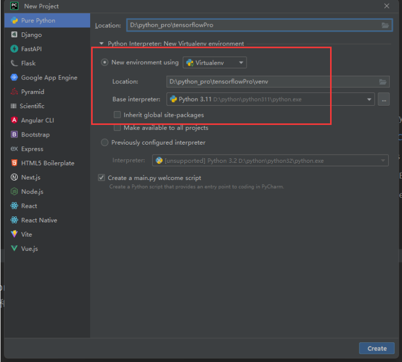 我们首先新建一个纯净python项目,Python版本3.11,我们选择使用虚拟环境,防止第三方库版本冲突。