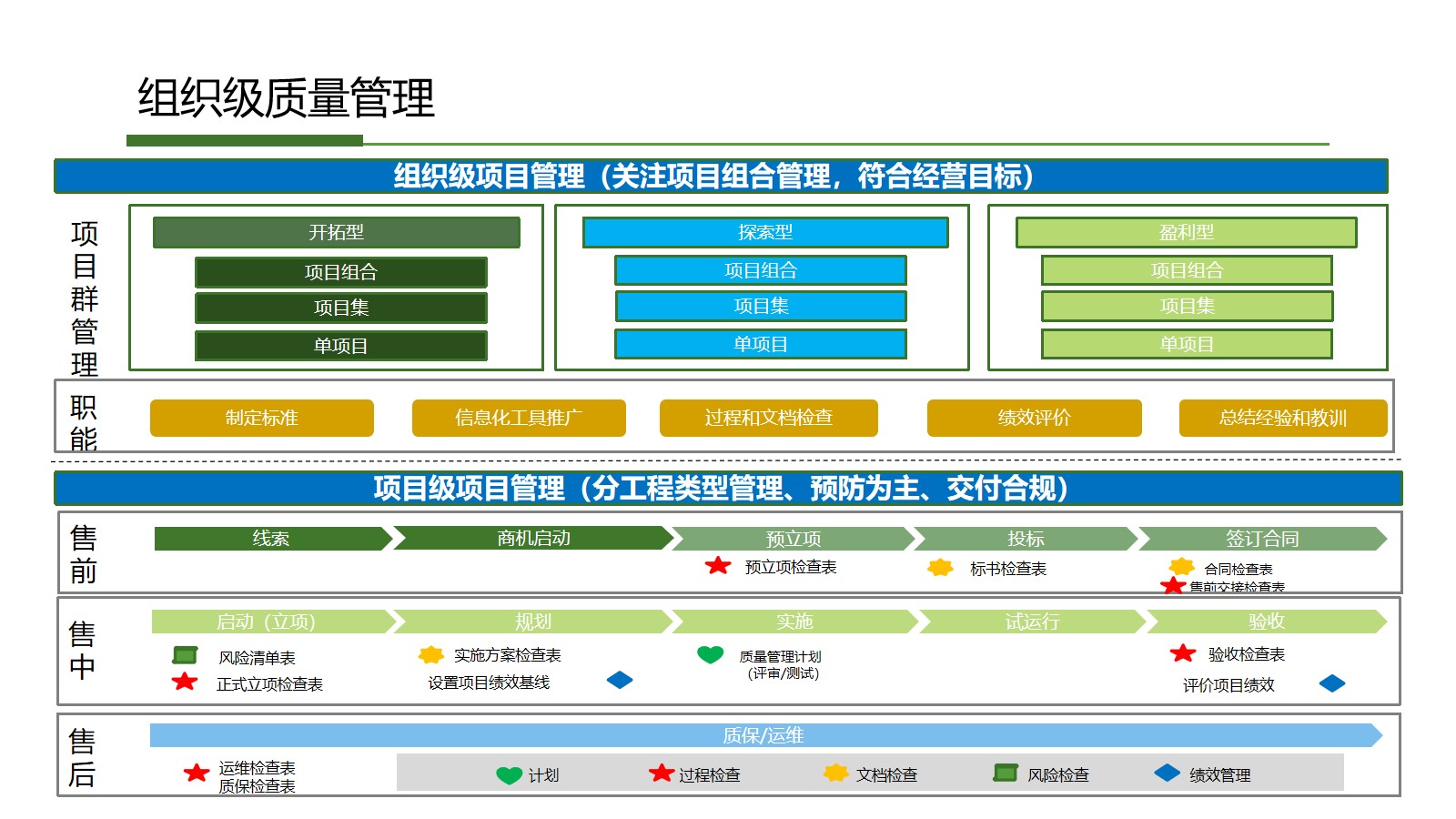 - 从公司经营视角划分项目类型(开拓型、探索型、盈利型),实施项目组合管理,明确项目优先级,建立项目治理框架,制定组合质量管理策略与制度体系;
