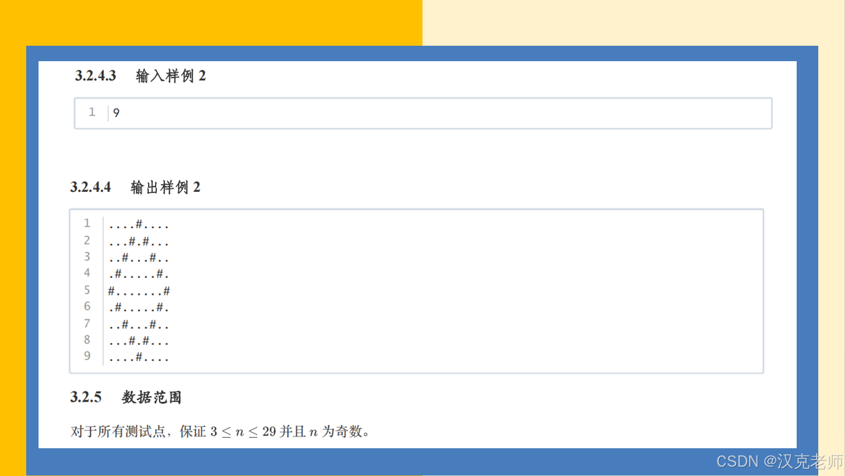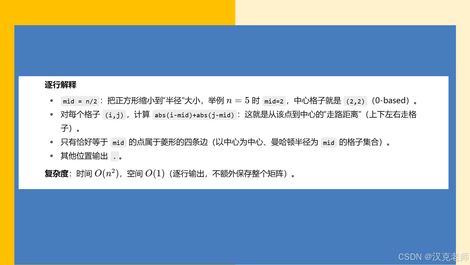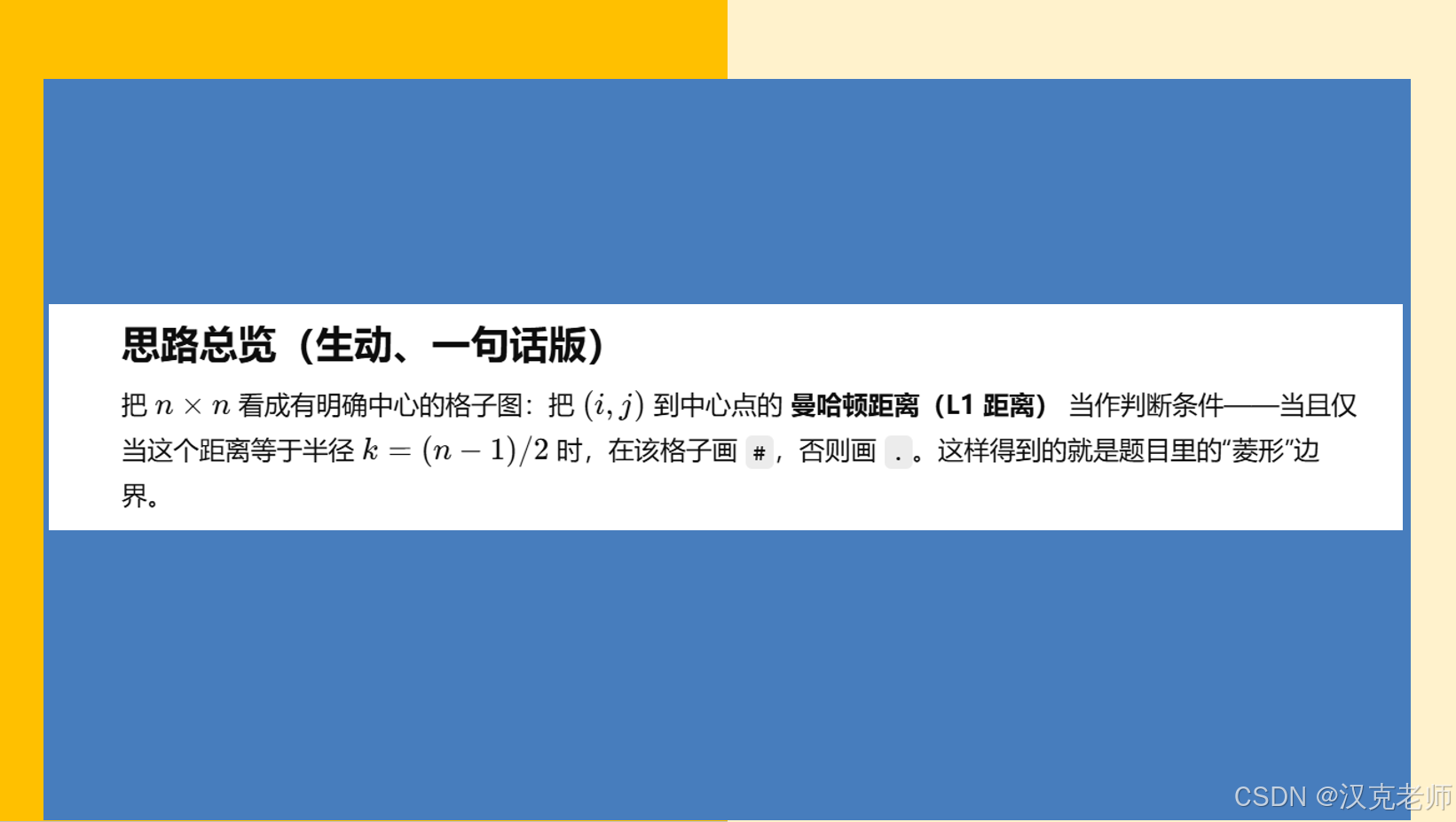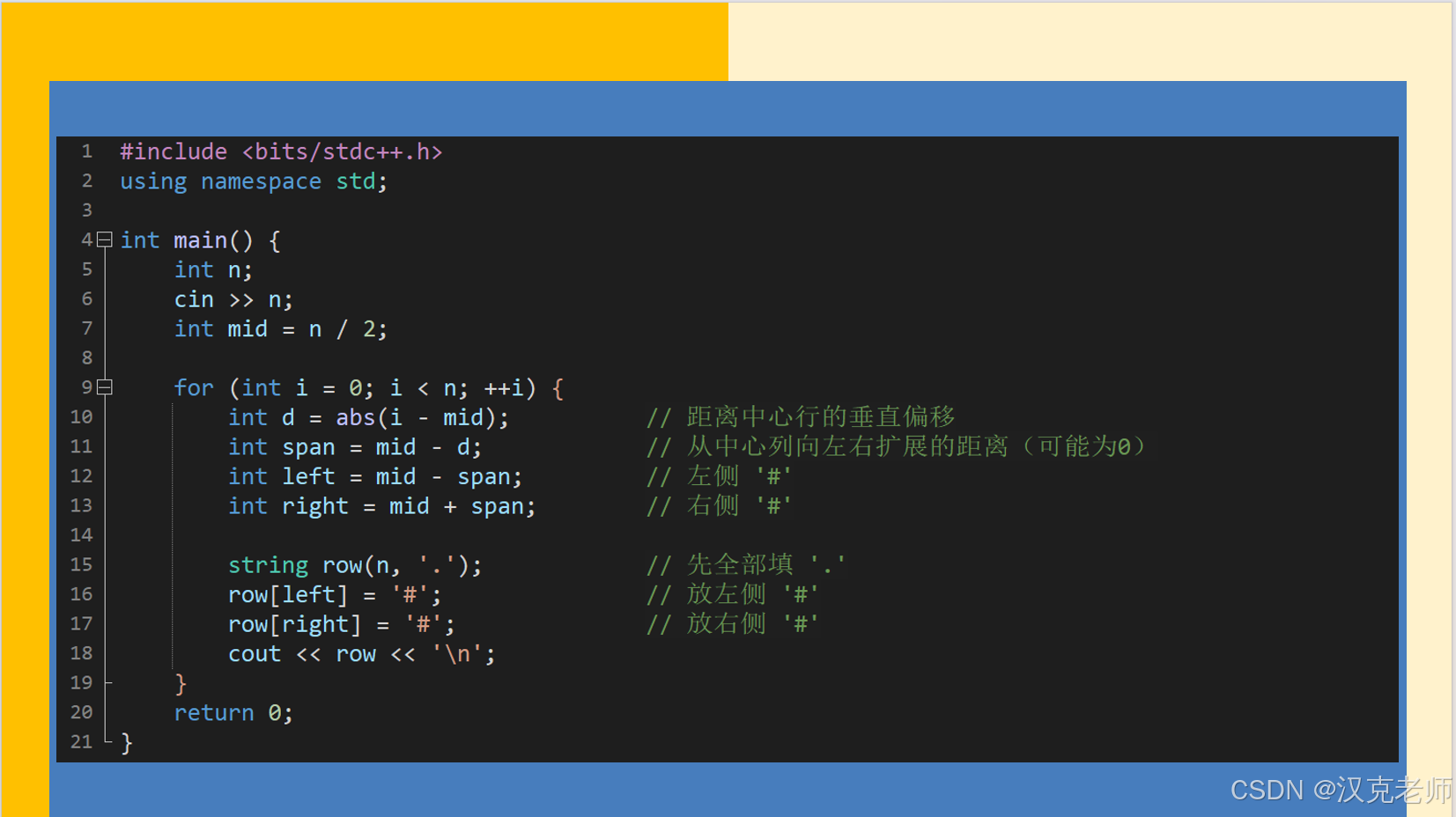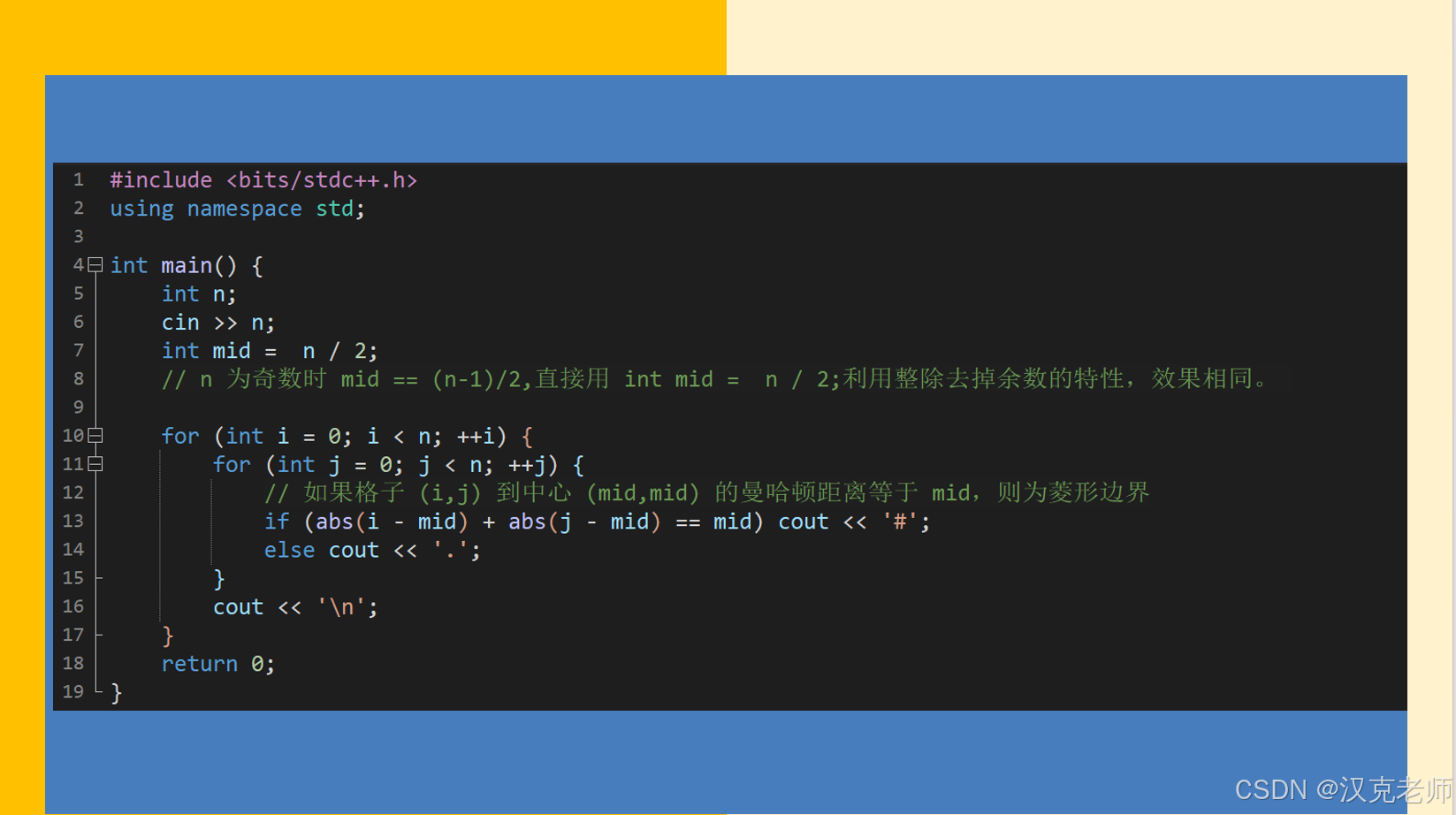 using namespace std;int main() {int n;cin >> n;int mid = n / 2; // n 为奇数时 mid == (n-1)/2,直接用 int mid = n / 2;利用整除去掉余数的特性,效果相同。 for (int i = 0; i < n; ++i) {for (int j = 0; j < n; ++j) {// 如果格子 (i,j) 到中心 (mid,mid) 的曼哈顿距离等于 mid,则为菱形边界if (abs(i - mid) + abs(j - mid) == mid) cout << '#';else cout << '.';}cout << '\n';}return 0;