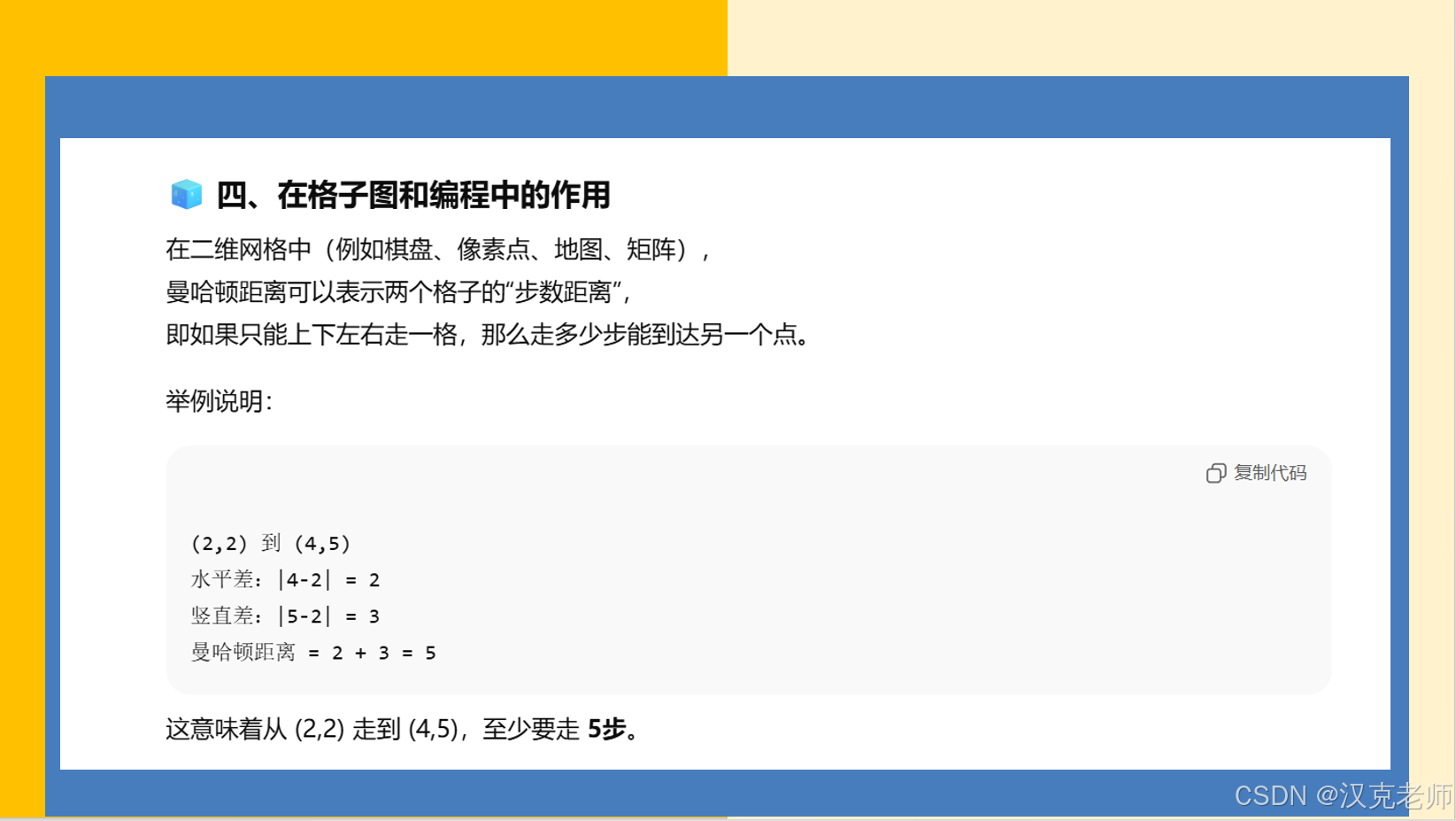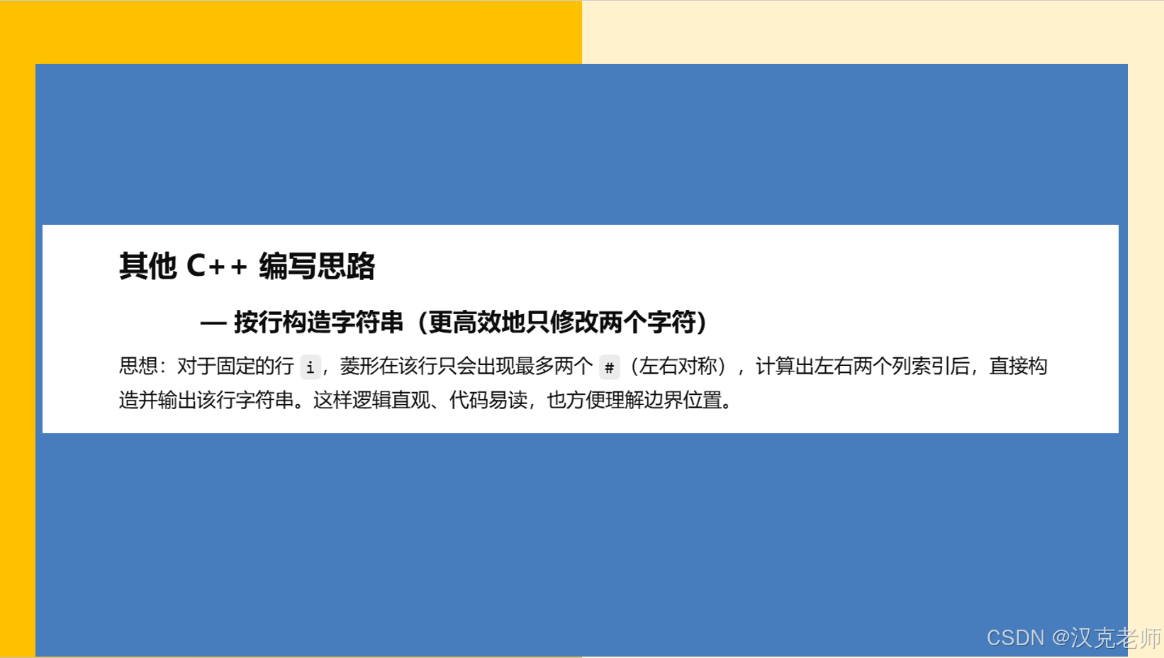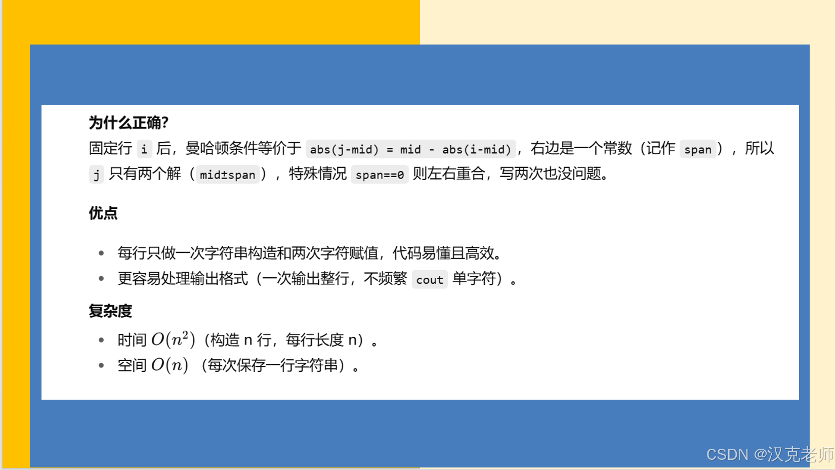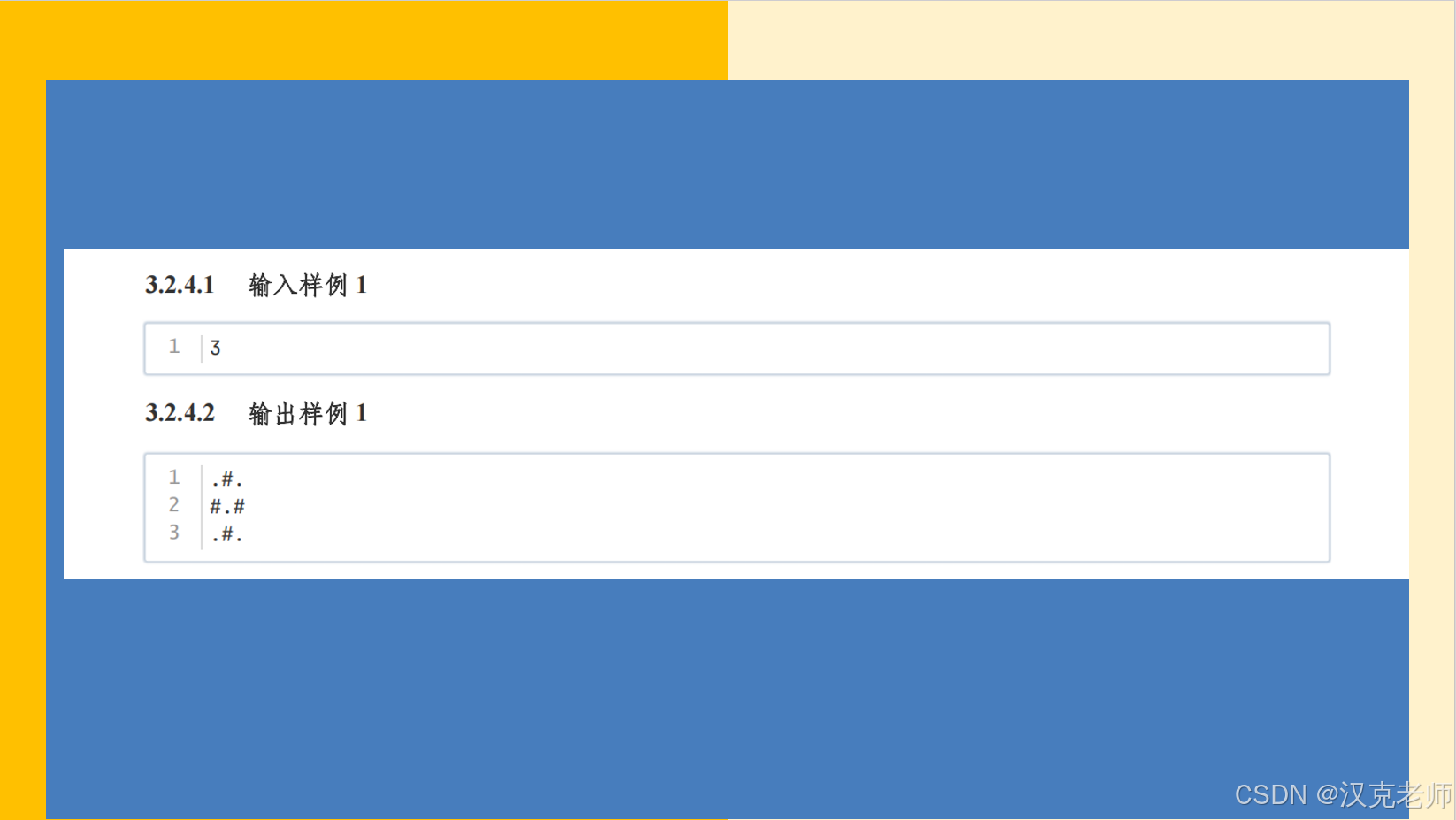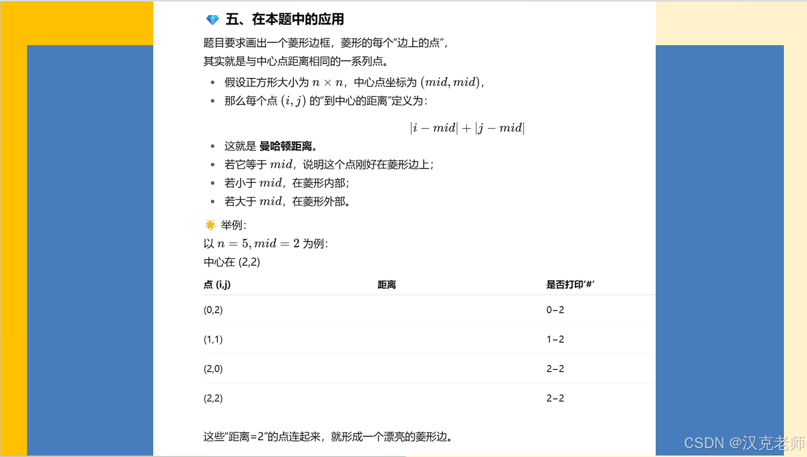 using namespace std;int main() {int n;cin >> n;int mid = n / 2; // n 为奇数时 mid == (n-1)/2,直接用 int mid = n / 2;利用整除去掉余数的特性,效果相同。 for (int i = 0; i < n; ++i) {for (int j = 0; j < n; ++j) {// 如果格子 (i,j) 到中心 (mid,mid) 的曼哈顿距离等于 mid,则为菱形边界if (abs(i - mid) + abs(j - mid) == mid) cout << '#';else cout << '.';}cout << '\n';}return 0;