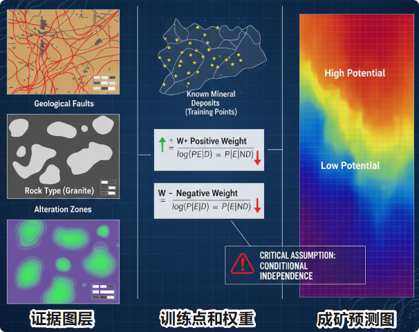 在机器学习兴起之前,证据权重法是连接地质理论与海量空间数据的关键桥梁。它成功地将地质学家的定性判断转化为可计算、可重复的定量模型,代表了成矿预测领域的一次重大方法学突破。