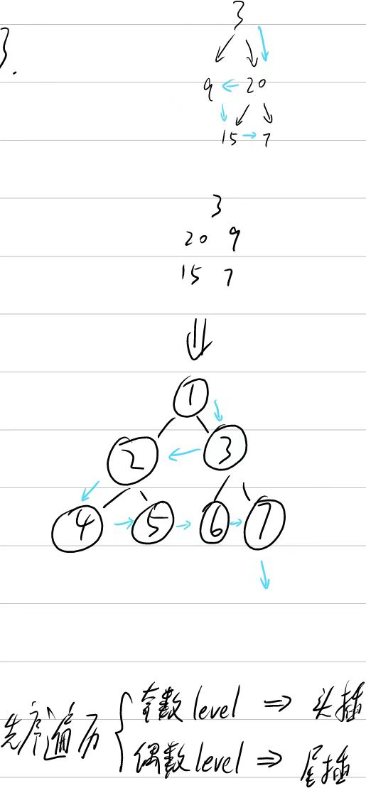 class Solution {List<List<Integer>> res = new ArrayList();public void preTravelTree(TreeNode root, int level){if(root == null)return;if(res.size() == level){ //添加列表【新的一层】List<Integer> new_level = new ArrayList();new_level.add(root.val);res.add(new_level);}else{ //已有列表List<Integer> old_level = res.get(level);if(level % 2 == 1){ //奇数层,头插old_level.addFirst(root.val);}else{ //偶数层,尾插old_level.addLast(root.val);}}preTravelTree(root.left, level + 1);preTravelTree(root.right, level + 1);}public List<List<Integer>> zigzagLevelOrder(TreeNode root) {preTravelTree(root, 0);return res;}