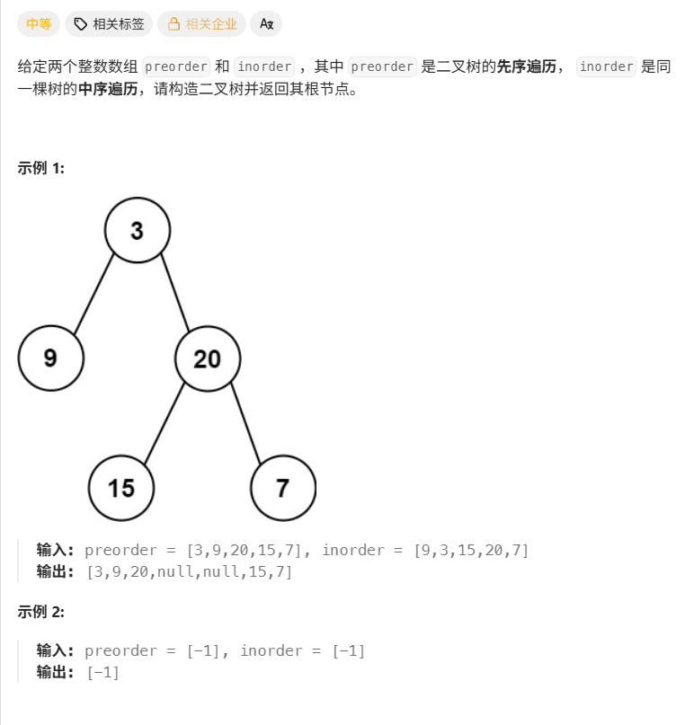 class Solution {private int i = 0;Map<Integer, Integer> m = new HashMap(); //构建键值对集合public TreeNode inorderTravel(int[] preorder, int[] inorder, int begin, int end){if(begin > end) //到底了return null;int mid = m.get(preorder[i]); //获得分割点TreeNode root = new TreeNode(preorder[i++]); //当前结点TreeNode left = inorderTravel(preorder, inorder, begin, mid - 1); //左子树TreeNode right = inorderTravel(preorder, inorder, mid + 1, end); //右子树root.left = left;root.right =right;return root;}public TreeNode buildTree(int[] preorder, int[] inorder) {for(int i = 0; i < preorder.length; i++)m.put(preorder[i], 0);for(int i = 0; i < preorder.length; i++)m.put(inorder[i], i);return inorderTravel(preorder, inorder, 0, preorder.length - 1);}