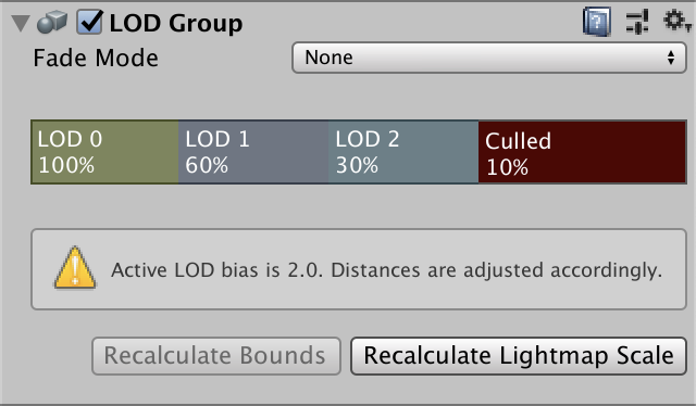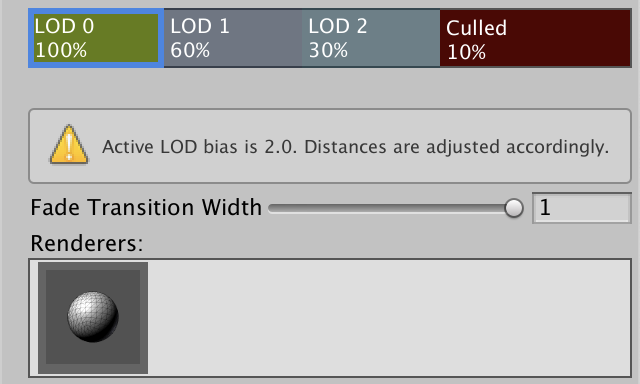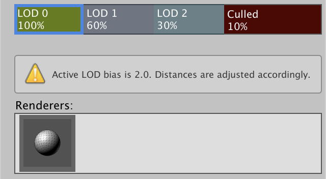 不过,质量项目设置中包含一个LOD偏差值,它会缩放这些阈值。默认设置为2,意味着评估时将预估视觉尺寸放大一倍。因此LOD 0最终会用于所有超过30%(而非60%)的物体。当偏差值设置为1以外的数值时,组件检查器会显示警告。此外还有一个最大LOD级别选项,可用于限制最高LOD级别——例如若设置为1,则LOD 1将替代LOD 0被使用。
