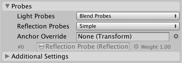 MeshRenderer组件提供了"锚点覆盖"功能,可用于微调它们使用的探针,而无需关注探针包围盒的大小和位置。此外还有"反射探针"选项,默认设置为"混合探针"。其理念是Unity允许在两个最佳反射探针之间进行混合。然而,此模式与SRP批处理器不兼容,因此Unity的其他渲染管线不支持此功能,我们也不会支持。如果您好奇如何混合探针,可以参考我2018年SRP教程中的反射章节,但我预计该功能将在旧版渲染管线移除后消失。未来我们将研究其他反射技术。因此目前仅有两个可用模式:关闭模式(始终使用天空盒)和简单模式(选择最重要的探针)。其他模式的功能与简单模式完全相同