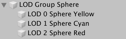 具体做法是将所有可视化LOD层级的游戏对象设为该组对象的子级。例如,我使用了三个相同尺寸的彩色球体来代表三个LOD级别