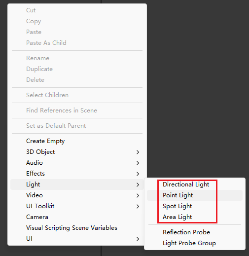 Unity 中支持的光源有4种,分别是点光源、平行光光源、聚光灯光源以及区域光光源。