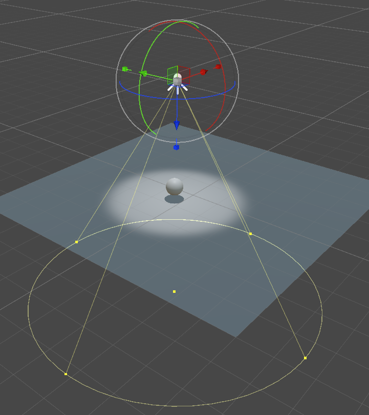 从一个点发出,按照一个圆锥体的范围照射,类似于舞台上的聚光灯。