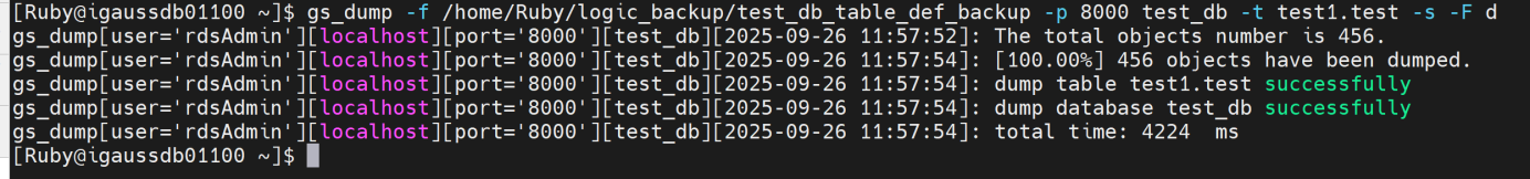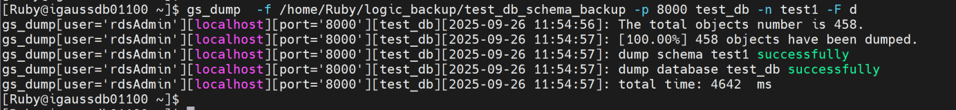 gs_dump -f /home/Ruby/logic_backup/test_db_schema_backup -p 8000 test_db -n test1 -F d