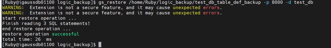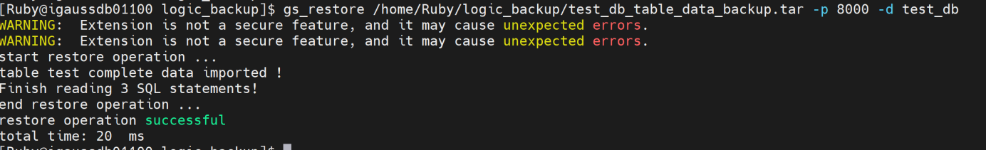 gs_restore /home/Ruby/logic_backup/test_db_table_data_backup.tar -p 8000 -d test_db