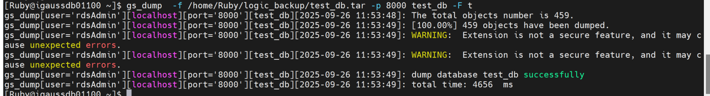 gs_dump -f /home/Ruby/logic_backup/test_db.tar -p 8000 test_db -F t