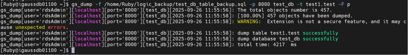 gs_dump -f /home/Ruby/logic_backup/test_db_table_backup.sql -p 8000 test_db -t test1.test -F p