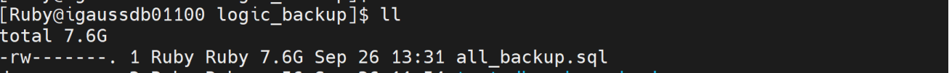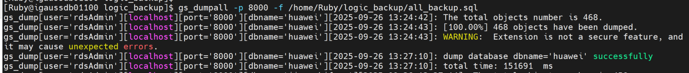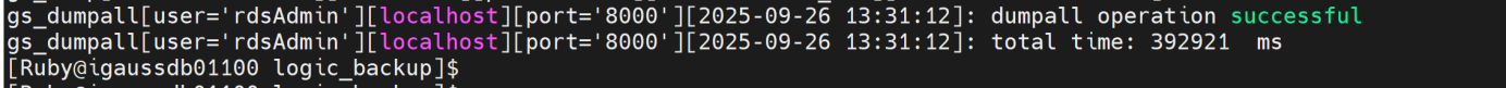 gs_dumpall -p 8000 -f /home/Ruby/logic_backup/all_backup.sql