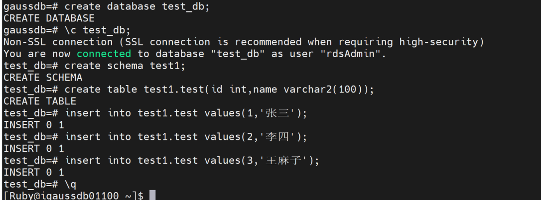 1.创建测试库、schema、表,并插入数据