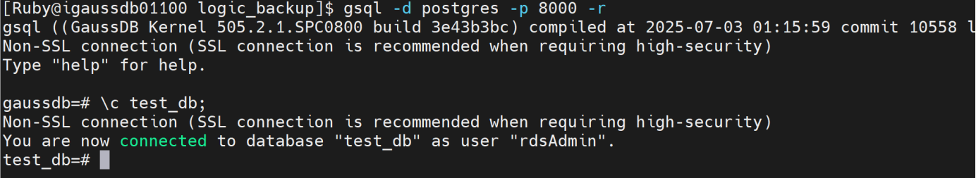 gsql -d test_db -p 8000 -r