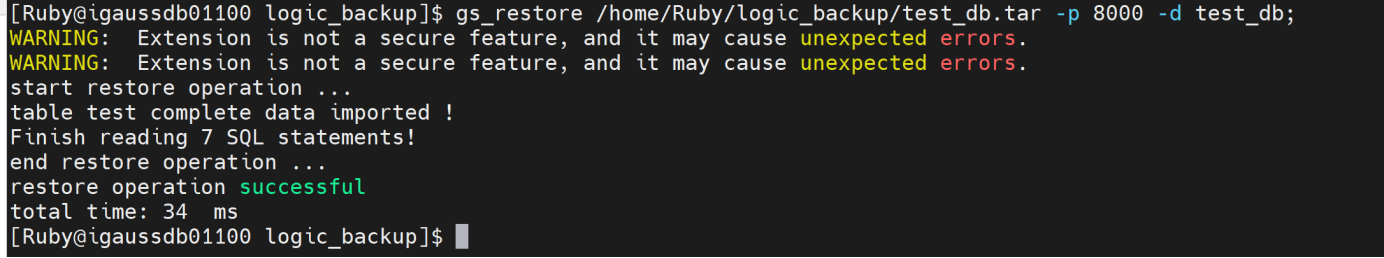 gs_restore /home/Ruby/logic_backup/test_db.tar -p 8000 -d test_db;