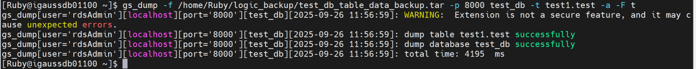 gs_dump -f /home/Ruby/logic_backup/test_db_table_data_backup.tar -p 8000 test_db -t test1.test -a -F t