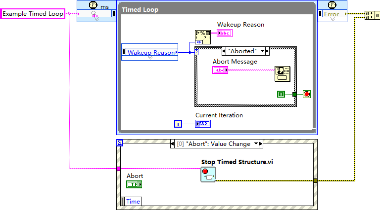 功能:展示Stop Timed Structure VI 如何中止定时循环,循环内会检测唤醒原因,若为 “Aborted” 则进行相应处理(如弹出提示)。