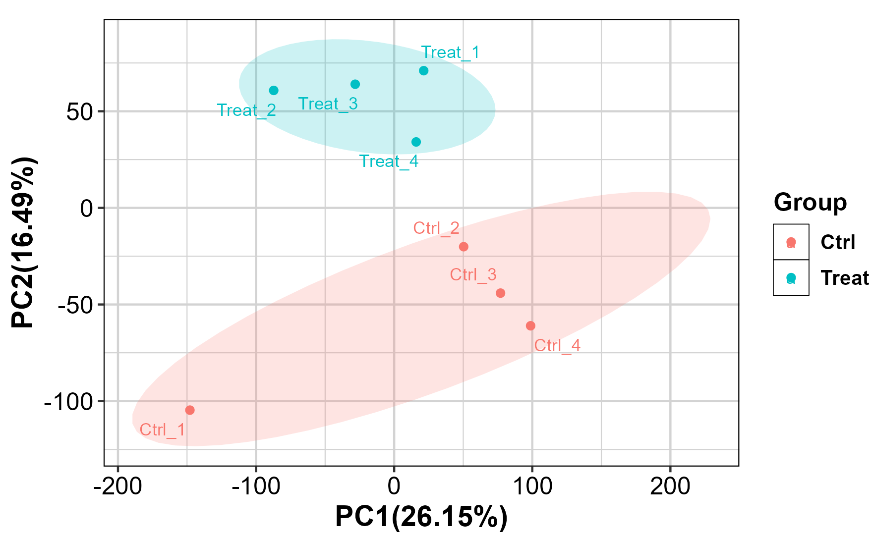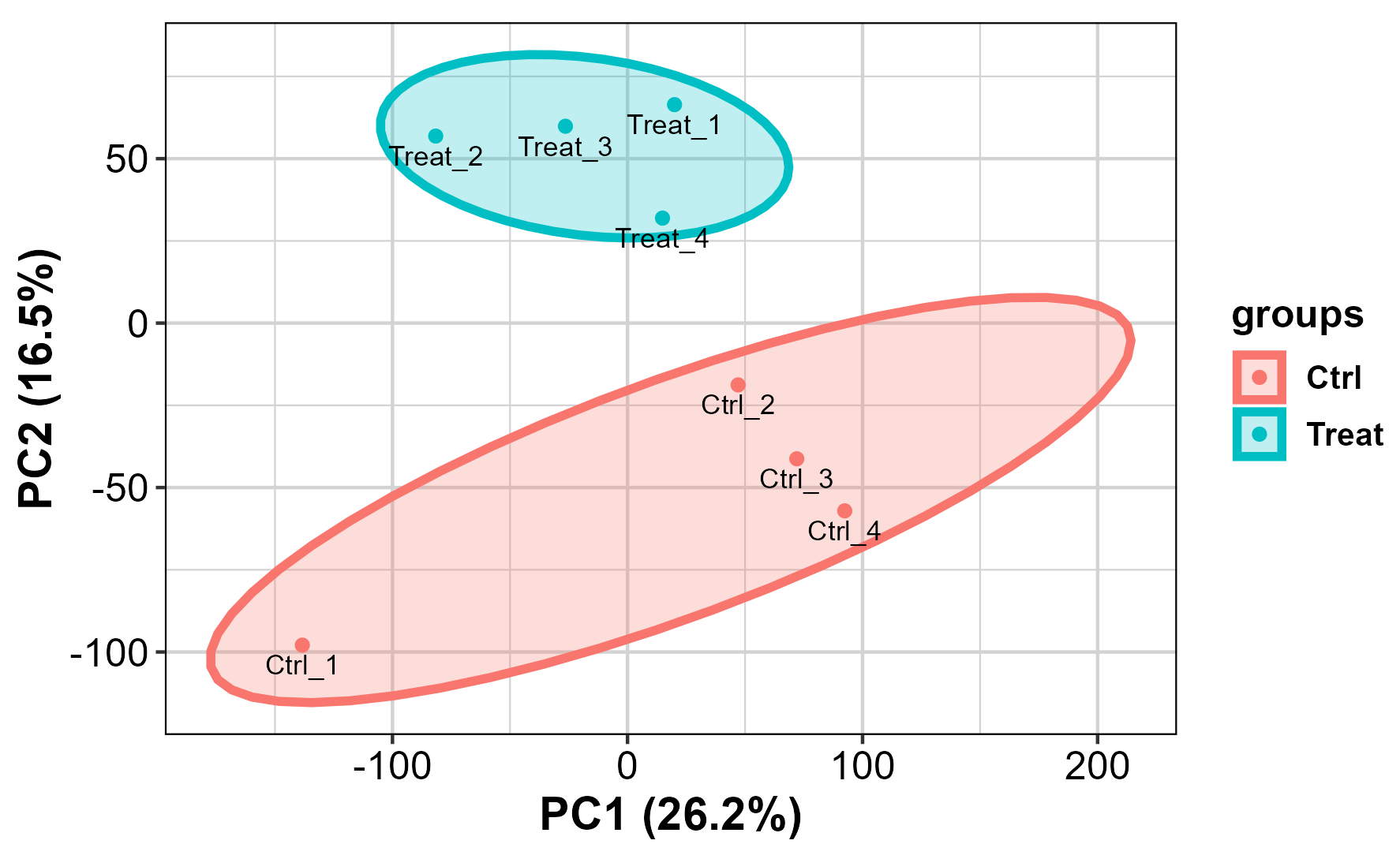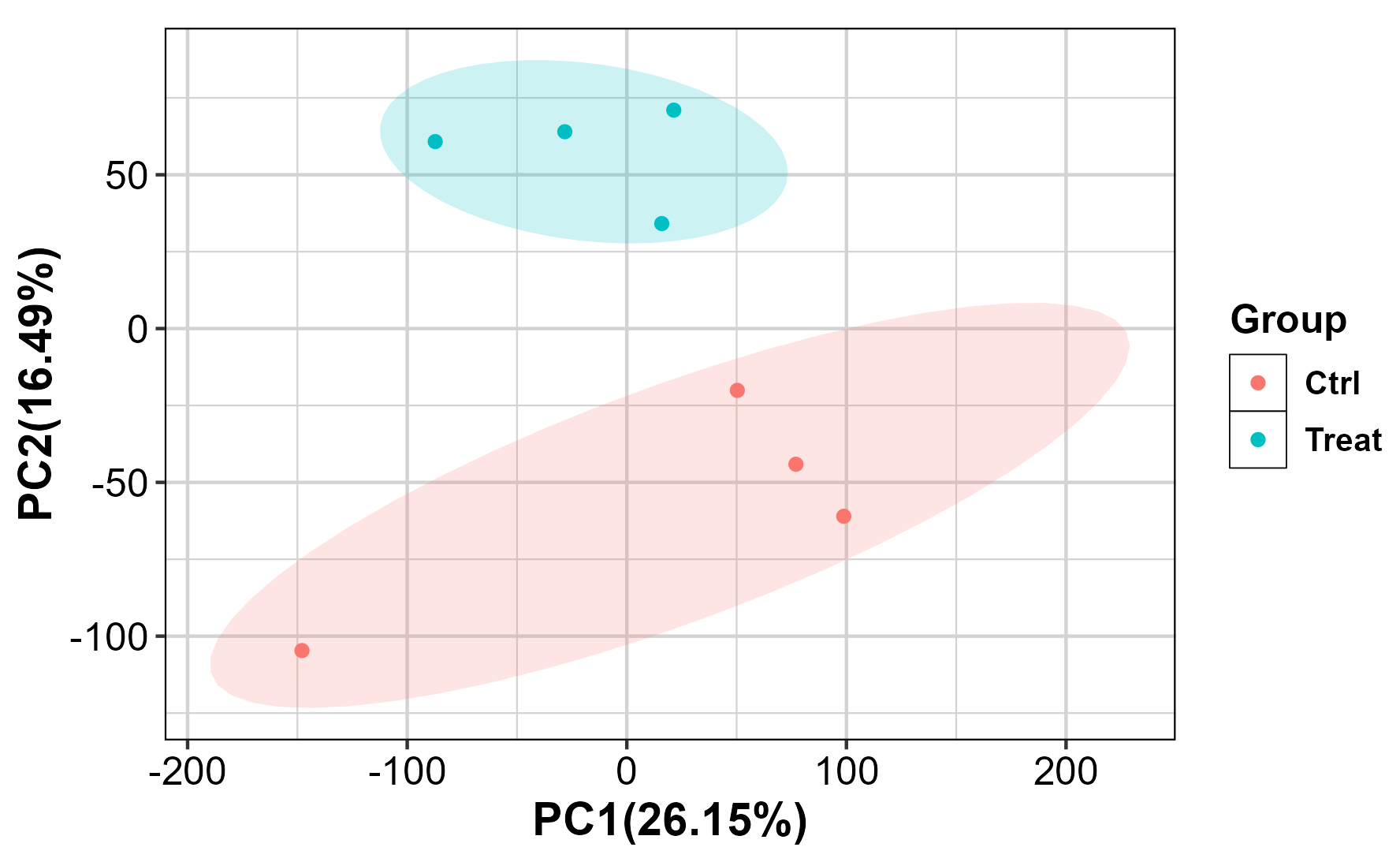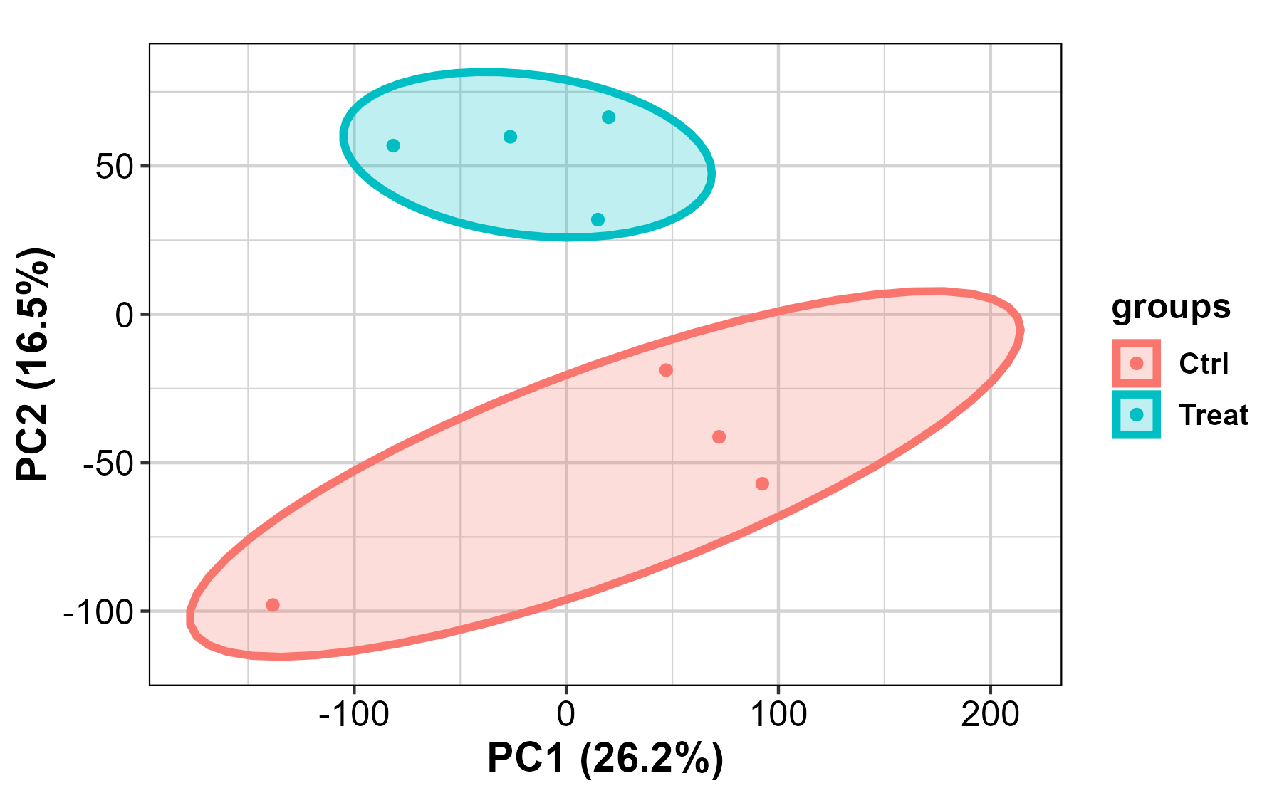 p_ggbiplot <- ggbiplot(PCADat, obs.scale = 1, var.scale = 0, ellipse = TRUE, circle = FALSE, var.axes = F, groups = group) +theme_custom + coord_fixed(ratio = 1.4) #调整x轴和y轴长度比例
