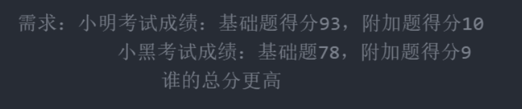 int main(){int score1 = sum(93,10);int score2 = sum(78,9);if(score1>score2){printf("小明的成绩更高");}else if(score1<score2){printf("小黑的成绩更高");}else{printf("两个人的成绩一样高"); } return 0;